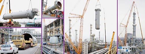 Schon bei der Anlieferung des Giganten wurde es spannend: Die Kolonne wurde in insgesamt vier Teilen geliefert, da die Kolonne unmöglich an einem Stück durch den Chemiepark transportiert werden konnte. Doch auch so war es ganz schön eng: das Kolonnenunterteil, die sogenannte Standzarge, und die drei Kolonnenschüsse wurden per Schiff über den Kanal angeliefert und westlich der Oelder Brücke abgeladen. Von dort aus ging es dann per Schwerlasttransport im Schneckentempo zur Baustelle. Teilweise war nur eine Handbreit Platz zwischen den kreuzenden Rohrbrücken und den Kolonnenteilen.