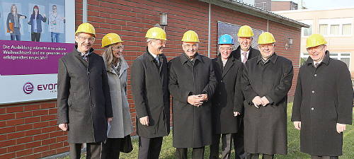 Bild: Hatten viel Freude bei ihrem Besuch der Ausbildung im Chemieparks Marl (von links): Standortleiter Prof. Dr. Walter Tötsch, Elisabeth Westermann, Leiterin Standortkommunikation, Evonik-Personalvorstand und Arbeitsdirektor Thomas Wessel, Bischof Dr. Felix Genn, Ausbildungsleiter Dr. Hans Jürgen Metternich, Caspar Gammelin (Leiter des Geschäftsbereichs Site Services), Weihbischof Dr. Christoph Hegge und Dr. Hermann-Josef Korte (Geschäftsgebietsleiter Ver- und Entsorgung).