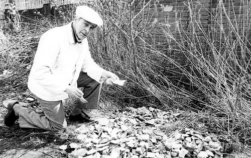 Bild: Paul Blazynski und die vermeintliche archäologische Sensation, der Hertener Feuersteinhaufen, dokumentiert von der Hertener Zeitung 1980. Foto Hertener Allgemeine/ Peter Rudolph