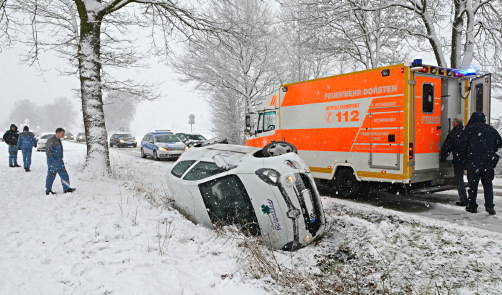 In Dorsten beispielsweise landete der Pkw eines Ambulanten Pflegedienstes im Straßengraben (Bild ganz oben). Der 39-jährige Dorstener war mit seinem Fahrzeug auf der L 608 in Fahrtrichtung Wulfen unterwegs. In Höhe des Autohauses Borgmann verlor er die Kontrolle über sein Fahrzeug und kam ins Schleudern. Der Mann kam mit leichten Verletzungen ins Krankenhaus.