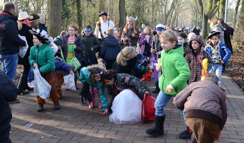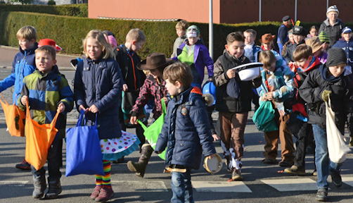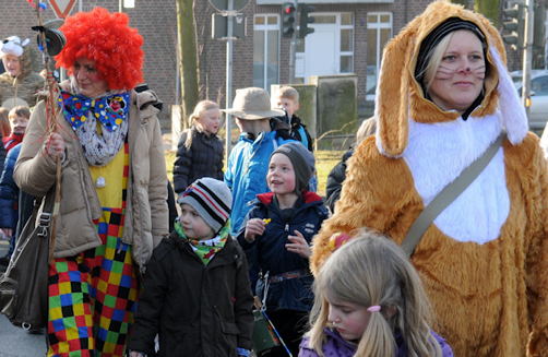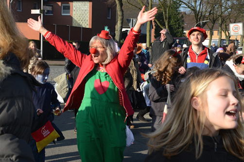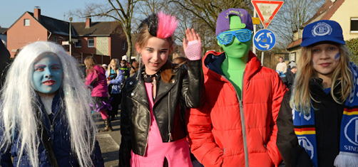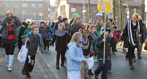 aus der Zuschauermenge auf die Kinderschar niederprasselte. Aufgeteilt nach Klassen marschierten die jungen Jecken samt Lehrer von der Grundschule aus, über den Schluerweg in Richtung Geschäftstrasse und weiter bis hin zum Altenheim an der Schulstraße. Anschließend ging es wieder zurück.
