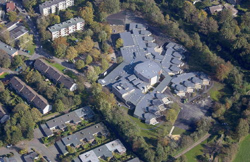 Bild: Ein waberndes Gebilde ist die Gebäudelandschaft in Drewer. Die Musik und eine Grundschule teilen sich die Räume. Luftbild: Metzendorf
