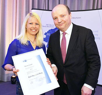Marl/Münster. Mit dem höchsten Bildungspreis der regionalen Wirtschaft hat IHK-Präsident Dr. Benedikt Hüffer die Evonik-Chemikantin Marina Fundel (Bild) in Münster als eine von 25 Auszubildenden und fünf Weiterbildungsabsolventen von Unternehmen aus dem Münsterland und der Emscher-Lippe-Region ausgezeichnet. Die junge Dame aus dem Chemiepark Marl gehörte im Jahr 2014 bei den jeweiligen Abschlussprüfungen in ihrem Beruf zu den Besten und wurde dafür von der Industrie- und Handelskammer (IHK) Nord Westfalen mit dem Karl-Holstein-Preis geehrt.