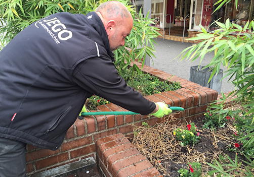 Bild: JEGO Mitarbeiter Thorsten Will bei der Neubepflanzung der Blumenbeete