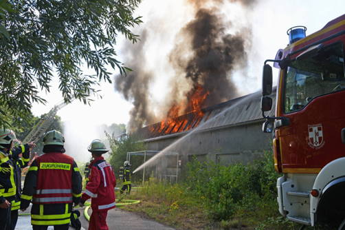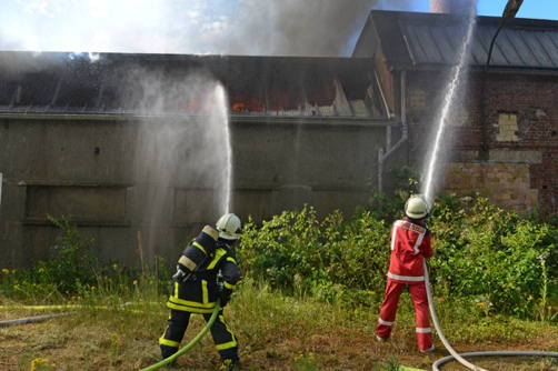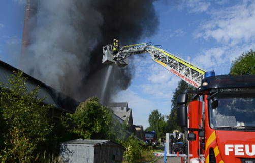 Nach der Alarmierung gegen 9.30 Uhr waren sieben Löschzüge im Einsatz. Der Brand wurde mit Wasser aus mehreren Strahlrohren bekämpft. Trupps arbeiteten sich unter Atemschutz ins Inneren der Halle vor. Außerdem waren auch zwei Drehleitern im Einsatz, um von oben aus die Flammen zu bekämpfen. Wegen der hohen Außentemperaturen leisteten die rund 70 Feuerwehrleute Schwerstarbeit. So wurden etliche Getränke angeliefert, damit die Männer mit ausreichend Flüssigkeit versorgt werden konnten und keinen Kollaps erlitten.