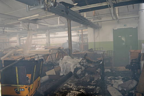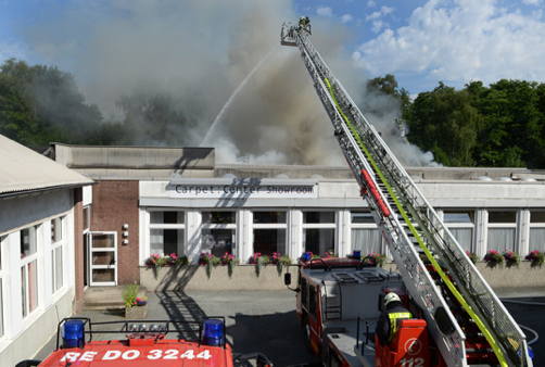 Der Einsatzleiter, so Feuerwehrsprecher Markus Terwellen, achtete sehr genau darauf, dass die Einsatzzeit der Männer in der Halle 20 Minuten nicht überschritt. Danach wurden die Leute ausgewechselt. In der Halle, die etwa 180 Meter x 60 Meter groß ist, werden Teppiche gelagert, die nun ein Raub der Flammen geworden sind.