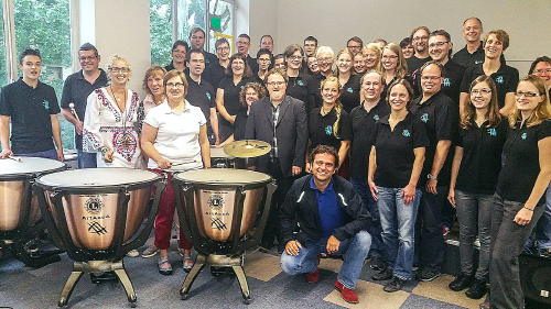 Bild: 40 Musiker und die Mitglieder des Lions Club Marl-im-Revier umrahmen die gespendeten Kesselpauken