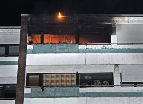Die anschließend eintreffenden Feuerwehreinheiten konnten sich dann sofort um die Brandbekämpfung kümmern. Zum einen über die Drehleiter auf der Rückseite und zum anderen durch das Treppenhaus. Eine Wohnung brannte komplett aus. Die Feuerwehr war mit mehreren Atemschutz-Trupps im Einsatz, die den Brand zügig unter Kontrolle bekamen. Teilweise schlugen die Flammen aus den Fenstern und griffen aufs Dach über, was aber von der Drehleiter aus gestoppt werden konnte. Nach den gut zweistündigen Löscharbeiten übernahm die Kriminalpolizei die Ermittlungen. Fotos: Bludau