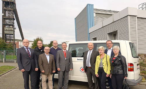 Das Bild zeigt die Übergabe des Transporters mit (v.l.): RAG-Gesamtbetriebsratsvorsitzender Norbert Maus, Gesamtbetriebsratsmitglied Thomas Prinz, Bezirksleiter Recklinghausen der IG BCE Karlheinz Auerhahn, Leiter der DRK-Notunterkunft Jörg van der Groef, DRK-Vorstandsvorsitzender Michael Vaupel, stellvertretender RAG-Vorstandsvorsitzender Peter Schrimpf, Betriebsratsvorsitzende des RAG-Servicebereichs Belegschaft Barbara Schlüter, Vorsitzender der Geschäftsführung der RAG Montan Immobilien Prof. Dr. Hans-Peter Noll, Gesamtbetriebsratsvorsitzende RAG Montan Immobilien Beate Otto. Foto: RAG/Dietmar Klingenburg