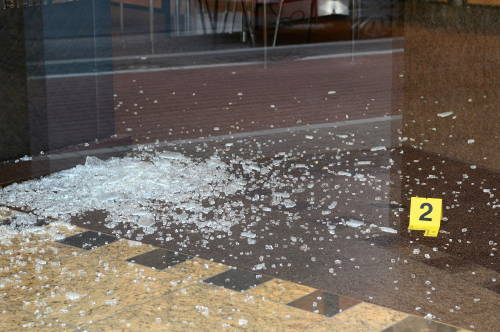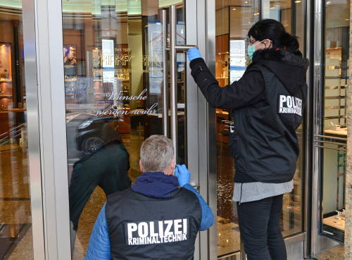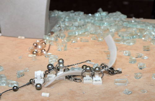 Bilder: Zurück blieben verwüstete Auslagen und nur wenige Ausstellungsstücke. Preisschilder lassen ahnen, welchen Wert die Räuber haben mitgehen lassen.