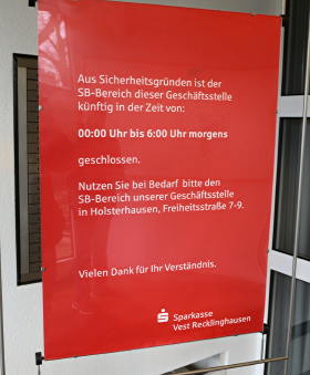Wegen der Serie von Geldautomaten-Sprengungen gingen Banken und Sparkassen dazu über, Automaten in den Vorräumen ihrer Filialen nachts zu sperren. So ist auch diese Sparkassenfiliale in Holsterhausen aus „Sicherheitsgründen“ von 0 bis 6 Uhr nicht zugänglich, wie ein Aushang am Eingangsbereich verrät.