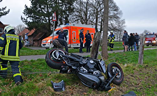 Haltern/Dorsten. Am Sonntag ereignete sich in Haltern am See ein schwerer Verkehrsunfall. Ein 50-jähriger Dorstener befuhr mit seinem neuwertigen Harley Davidson Motorrad die Straße Neuer Kamp in Haltern-Lippramsdorf. Vor einer Linkskurve überholte er einen vorausfahrenden Pkw. Nach dem Überholvorgang kam der Mann von der Fahrbahn ab, verlor die Kontrolle über seine Maschine, kam ins Schleudern und überschlug sich. Der Zweiradfahrer überfuhr dabei einen Leitpfosten, rutschte über den Radweg und prallte in einen Weidezaun. Hier blieb das schwere Motorrad hängen.