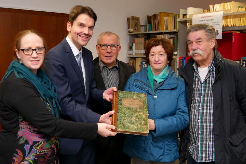 Bild: Kirsten Noetzel, Leiterin des Stadtarchives, Bürgermeister Dr. Uli Paetzel, Hans-Jochen Schräjahr, Elimar Koch und Günter Koch (v.l.) bei der Übergabe der Westerholter Chronik an das Stadtarchiv Herten.