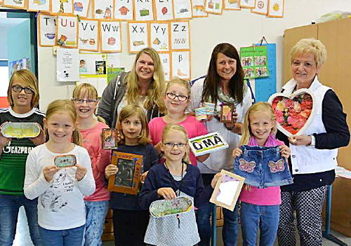 Bild: Stolz präsentieren die Kinder ihre Werke, die sie aus vermeintlichen Müll gebastelt haben. Begleitet wurden sie von den Mitarbeiterinnen der Offenen Ganztagsbetreuung Jennifer Heide (links), Renate Ungetüm (rechts) und Nina Lengwenus.