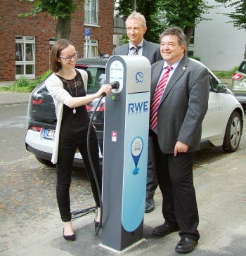 Marl. An der Rathenaustraße 17 steht ab sofort eine Ladesäule für Elektrofahrzeuge. In dieser Woche nahmen Bürgermeister Werner Arndt und RWE-Kommunalbetreuer Dirk Wißel die neue Stromtankstelle in Betrieb.