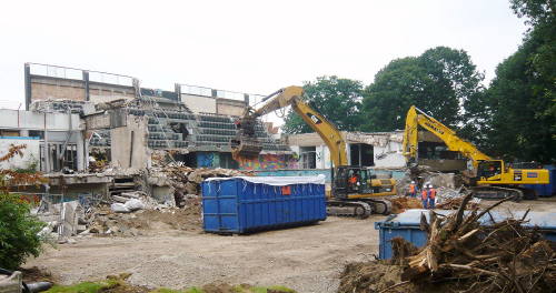 Zur Zeit werden in dem großen Schwimmbecken die Dachreste herausgeholt, danach wird die „große Schere“ angesetzt. Damit werden dann alle überirdischen Betonelemente nach und nach „abgeknabbert“ und schließlich alle Fundamente mit einem überdimensionierten Meißel bearbeitet. Der Bauschutt wird an Ort und Stelle auf eine „transportfähige Größe“ zerkleinert, sortiert und zum VCC-Betriebshof nach Castrop-Rauxel transportiert, wo das Material für die Weiterverwertung aufbereitet wird.