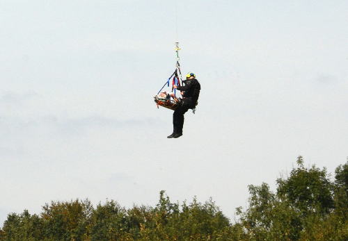 Nach ersten Meldungen wurden die beiden Insassen verletzt, einer davon schwer. Die Rettungskräfte sind mit einem Großaufgebot im Einsatz. Da sich die Absturzstelle in einem schwer zugänglichen Gebiet befindet, waren auch Hubschrauber im Einsatz. Aus einem haben sich Polizeibeamte abgeseilt, um zu den Verletzten vorzudringen. Sie wurden über eine Seilwinde gerettet (Bild unten).