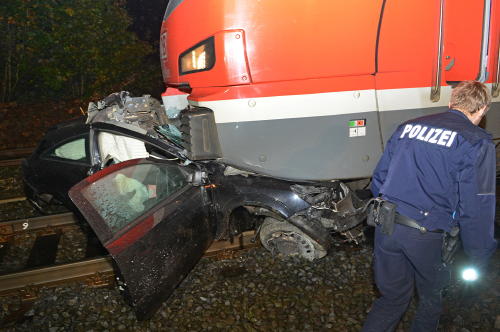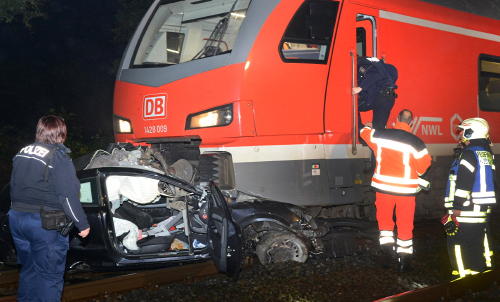 Gegen 23.45 Uhr befuhren die beiden Duisburger die Marler Straße in Richtung Marl, als sie vor dem Bahnübergang der Bahnstrecke Münster-Essen aus unbekannter Ursache von der nassen und mit Herbstlaub bedeckten Fahrbahn abkamen. Das Auto prallte dann gegen ein Andreaskreuz und rutschte ins Gleisbett, wo der Opel Astra demoliert liegen blieb. Der 25-Jährige und sein 29-jähriger Beifahrer sahen den herannahenden Regionalexpress und verließen fluchtartig das Fahrzeug. Der 48-jährige Lokführer aus Lingen konnte eine Kollision nicht verhindern, erfasste das leere Auto und schleifte es etwa 200 Meter mit. Auch der DB Zug RE 2 mit dem Ziel Recklinghausen wurde durch den Crash im Frontbereich beschädigt. Bei der Kollision verletzten sich weder Zugführer noch Passagiere.