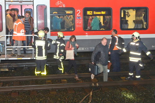 Die Passagiere aus dem Zug wurden durch die Feuerwehr aus dem Zug begleitet und mit Taxen und Bussen weitergefahren. Die Bahnstrecke musste gesperrt werden, die Bergungsarbeiten dauerten am Dienstag Morgen noch an. Fotos: Bludau