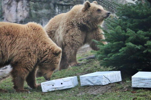 Bei den drei Braunbärinnen Smilla, Frieda und Alma, die seit dem Frühjahr in Gelsenkirchen wohnen, gab es einen Tannenbaum und gleich drei verpackte Geschenke, die mit einem Rindfleisch-Festtagsbraten gefüllt waren. Die kuschligen Damen teilten sich die Pakete freundschaftlich untereinander auf, nur bei der Frage, wem der Baum gehört, kam es zu einer kleinen Auseinandersetzung. Â