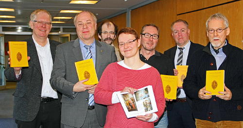 Bild: Landrat Cay Süberkrüb und Dr. Matthias Kordes (Herausgeber und Leiter des Instituts für Stadtgeschichte/Stadt- und Vestisches Archiv) die Autoren stellen gemeinsam den neuen Band der Vestischen Zeitschrift vor.
