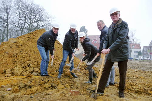 Zum ersten Spatenstich trafen sich (im Bild v.l.) Wolf-Christian Angott (Rudimo), Rafael Rösner (Rösner Immobilien), Dr. Kirsten Schulte-Kemper (Rudimo), Frank Wieschollek als zuständiger Architekt und Wolfgang Quecke (ebenfalls Rudimo). Der erste Bauabschnitt mit 14 Wohnungen soll Ende 2017 bezugsfertig sein.