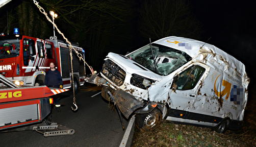Haltern. Am Freitag, gegen 21.25 Uhr befuhr ein 27 Jahre alter Fahrer eines Paketdienstes mit seinem Transporter die Lavesumer Straße von Lavesum in Fahrtrichtung Haltern. Im Bereich der Einmündung Helenhöhe verlor der Fahrer im Ausgang einer Linkskurve die Kontrolle über sein Fahrzeug.