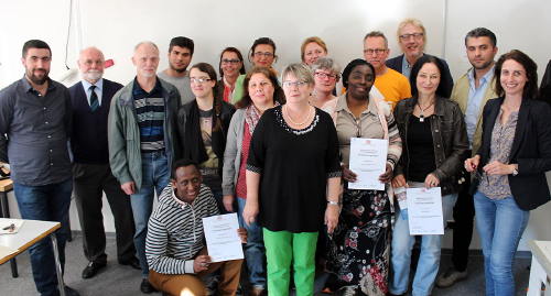 Bild: Die neuen Einbürgerungslotsen präsentieren stolz ihre Zertifikate. Mit im Bild die Kursleiterinnen Elke Haunschild (vorne) und Marina Chatziioannidou (r.). Foto: Stadt Marl