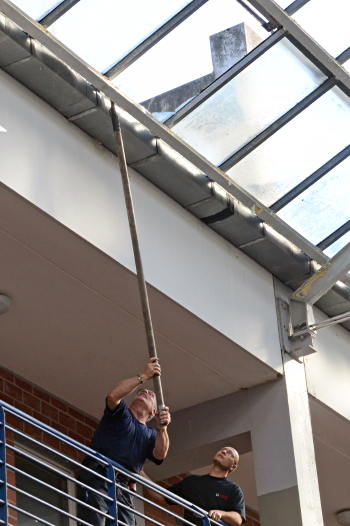 Die „Höhenkletterer“ suchten anschließend das Weite. Später beseitigte die Feuerwehr Dorsten die Gefahrensituation. Die zersplitterten Scheiben wurden mit Hilfe eines so genannten Einreißhakens (Bild) entfernt. Lautstark krachten sie zu Boden, wo sie anschließend von den Einsatzkräften entfernt wurden. Foto: Bludau