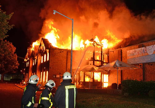 Das Feuer war offenbar kurz nach Geschäftsschluss um 23 Uhr ausgebrochen. Mitarbeiter und Gäste befanden sich nach Angaben der Feuerwehr nicht mehr im Gebäude. „Wir wurden eigentlich wegen eines Dachstuhlbrandes alarmiert, merkten aber schnell, dass es größer ist“, sagte Feuerwehrsprecher Markus Terwellen.