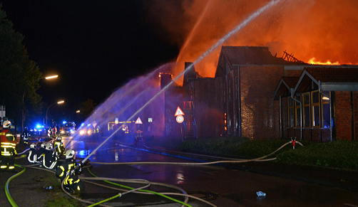 Das Dach stürzte ein, das Gebäude brannte komplett aus. Immerhin gelang es den Einsatzkräften, die benachbarte Sporthalle des Gymnasium Petrinum zu schützen. Wasser wurde aus allen Hydranten in der Umgebung und auch aus der Lippe entnommen. Mit mehreren Drehleitern bekämpften die Wehrleute die Flammen.
