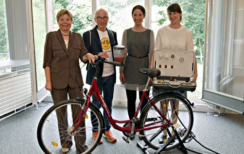 Direkt am Anfang des Besuchs erwartete die beiden Interviewerinnen Alice Berger von der „Stiftung Deutscher Nachhaltigkeitspreis e. V.“ und Dr. Jasmin Honold vom „Deutschen Institut für Urbanistik“ ein Highlight: In der Brücke des Rathauses stand das Hertener Energiefahrrad bereit. Das Treten in die Pedale erzeugt mit einem Generator Strom und bringt einen Mixer in Gang. Also hieß es: Strampeln für einen frischen Smoothie. Das übernahm Bürgermeister Fred Toplak als Sportler natürlich höchstpersönlich und die Gäste konnten wenig später ihr Getränk genießen.
