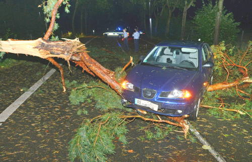 Nach bisherigen Erkenntnissen wurden Menschen nicht verletzt. Allerdings gab es erhebliche Sachschäden. So wurde zum Beispiel auf dem Marler Damm ein fahrendes Fahrzeug von einem Baum getroffen. Der 37-jährige Fahrer aus Marl kam mit dem Schrecken davon. Neben dem Marler Damm musste auch die B 58 (Weseler Straße) zwischen Wulfen und Deuten voll gesperrt werden. Hier waren mehrere Baumkronen aus teilweise massiven Bäumen herausgebrochen und blockierten oder gefährdeten den Verkehr. Foto: Bludau