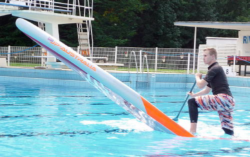 Marl. In der Cafeteria im Guido-Heiland-Bad: Die Stadt Marl stellt ihr Programm zum VolksParkFest vor. Mit dabei: Oliver Lynen vom Marler Kanu-Club. Im Gepäck hat er ein Surfbrett und Paddel. „Stand-up-Paddeln ist die Trendsportart schlechthin“, schwärmt der Sportwart. Zum ersten Mal stellt sich sein Club beim Volksfest einem breiten Publikum vor.