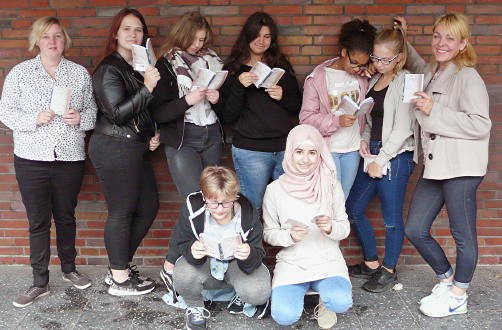 Bild: hinten v.l.n.r. : Gleichstellungsbeauftragte Maresa Kallmeier, Angelina. Eileen, Josefine, Alicia, Celina und Sylvia Steffan vom Kinder- und Jugendschutz der Stadt Herten sowie Josie und Alaa (vorne v.l.n.r.) freuen sich über den neuen Mädchenmerker.