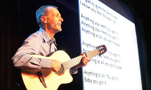 Stefan Nussbaum singt, spielt dazu gekonnt Gitarre und moderiert auf charmante Weise. Wie immer muss niemand Angst vor Textpatzern haben, denn die Songtexte wirft ein Beamer an die Wand. Der Eintritt für das MitSingDing kostet 8 Euro.
