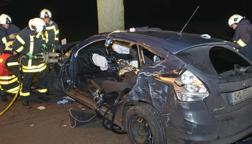 Dorsten/Marl. Ein 47-jähriger Auslieferungsfahrer aus Marl übersah in einem Kreuzungsbereich im Ortsteil Lembeck einen 33-jährigen Pkw-Fahrer aus Gronau, der auf der Lippramsdorfer Straße unterwegs war. Der Pkw Ford wurde von dem Transporter seitlich erfasst und frontal gegen einen Straßenbaum abgedrängt. Der Mann aus Gronau wurde durch den Aufprall schwerst verletzt. Die Feuerwehr befreite ihn mit Schere und Spreizer aus seinem völlig zerstörten Wagen. Der Fahrer des Kleintransporters blieb – bis auf einen Schock – unverletzt. Foto: Bludau