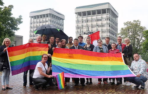 Bild: Flagge für Toleranz und sexuelle Vielfalt zeigten Vertreter der Politik, Bürgermeister Arndt und Marler Bürger. Foto: Stadt Marl