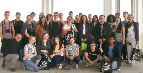 Bild: Gemeinsam mit Bürgermeister Werner Arndt besichtigten die Jugendlichen den Rathausturm und erfuhren einiges über die Wassernutzung in Marl.