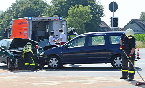 Gegen 10.20 Uhr wollte ein 66-jähriger Autofahrer aus Voerde nach links in die Münsterstraße abbiegen und stieß dabei mit dem Pkw einer entgegen kommenden 66 Jahre alten Autofahrerin aus Haltern am See zusammen. Die Verletzte wurde von einem Notarzt vor Ort versorgt und anschließend ins Krankenhaus zur weiteren Behandlung transportiert. Die Kreuzung Münsterstraße/Sythener Straße blieb für die Unfallaufnahme durch die Polizei gesperrt. Die Feuerwehr Haltern streute auslaufende Betriebsmittel ab und klemmte die Fahrzeugbatterien ab. In allen Fahrtrichtungen kam es zu Verkehrsstörungen.