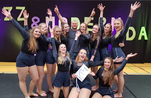 Bild: Die Mädchen der Jazz-and-Modern-Dance -Formation elation des TSC Schwarz-Silber Marl e.V. freuen sich zusammen mit ihrem Trainer Mirko Müller (Mitte) über ihren vierten Platz beim Liga-Turnier in Versmold.