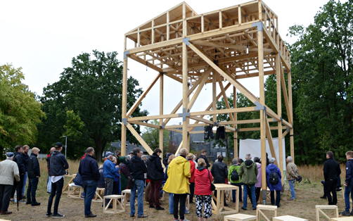 Dorsten. Trotz anfänglicher Regenschauer und kühlen Temperaturen wurde die feierliche Eröffnung der Projektwoche „Auf Wiedersehen Utopia“ am Samstagnachmittag ein Erfolg. Acht Studenten und ihr Professor samt wissenschaftliche Helfer vom Institut für Architektur der TU Berlin hatten in den vergangenen Tagen auf einer Wiese an der Dimker Allee einen sechs Meter hohen Pavillon aufgebaut.