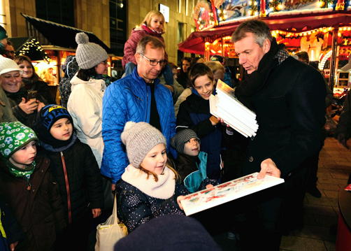Bild: Auf dem Platz vor dem Palais Vest verteilte Bürgermeister Christoph Tesche 1000 kostenlose Adventskalender an große und kleine Besucher des Weihnachtsmarktes.