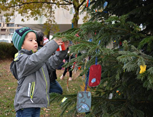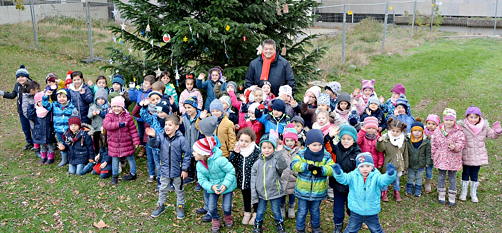 „Es ist immer wieder schön zu sehen, wie aufgeregt und begeistert die Kinder bei der Sache sind“, freute sich Werner Arndt. Während die Mutigsten mit Unterstützung des Stadtoberhauptes auf die Leiter steigen und den kreativen Baumschmuck an die Tanne hängen, singen Schülerinnen und Schüler der Aloyiusschule zusammen mit ihrer Lehrerin Antje Hütter an der Gitarre und Brigitte Braunstein von der städtischen Musikschule weitere Weihnachtslieder.
