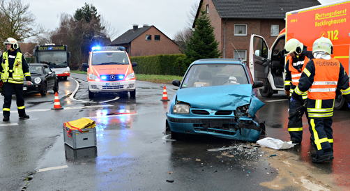 Neben der Feuerwehr Haltern wurden auch Rettungsmittel aus Marl, Dorsten und Recklinghausen angefordert. Eine 89-jährige Halternerin befuhr die Lavesumer Straße und wollte mit ihrem VW Golf in die Rekener Straße abbiegen. Dabei missachtete sie die Vorfahrt einer 52-Jährigen Frau aus Waltrop, die nicht mehr rechtzeitig reagieren konnte, sodass die Wagen zusammenstießen.