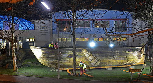Sie konnten jeweils bis zu einem halben Jahr an dem Nachbau des historischen Schiffes mitarbeiten, so dass von Anfang Dezember 2016 bis Ende Mai 2018 insgesamt 48 Personen daran mitgewirkt haben. Nun wurde die Aak von der Werkstatt Nies zum Freizeitbad Atlantis überführt. Und das am späten Abend um Verkehrsbehinderungen weitestgehend zu vermeiden.