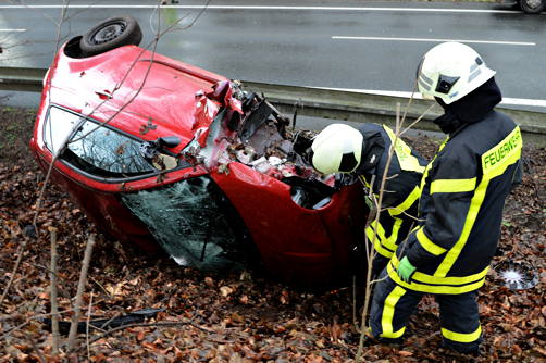 Hier riss beim Aufpralls ein Rad des Wagens ab. Anschließend überschlug sich das Fahrzeug und blieb hinter der Leitplanke auf der Seite liegen. Unfallzeugen eilten zur Hilfe und befreiten die Fahrerin aus dem Wrack. Ein Notarzt versorgte die schwerverletzte Marlerin noch vor Ort, bevor sie zur weiteren Behandlung in ein Krankenhaus kam. Polizei und Feuerwehr sicherten die Einsatzstelle ab und sperrten die Straße für den Verkehr. Ein Abschlepper musste den Wagen bergen. Foto: Bludau