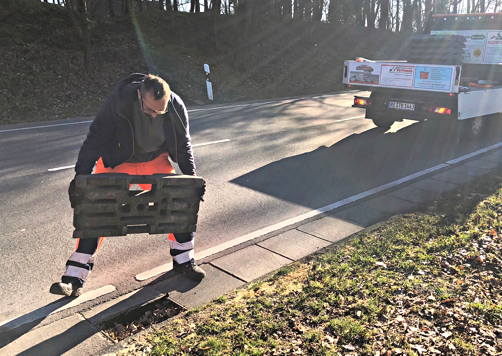 Bild: Allein am Wittenberger Damm fehlen alle 20 Meter die seitlichen Abdeckungen eines Regeneinlaufs. Mitarbeiter des städtischen Tiefbau- und des Ordnungsamtes sind zurzeit dabei, offene. Gullys zu suchen und die Schächte zu sichern – entweder mit neuen Deckel oder mit Warnbaken. Foto: Bludau