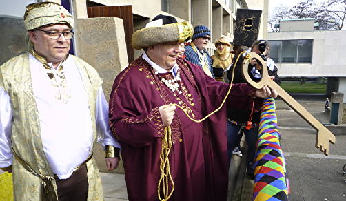 Nach diesem ironischem Wortgefecht musste sich das Stadtoberhaupt, mit einem goldenen Turban und einem osmanischem Gewand verkleidet, geschlagen geben und rief den Jecken vom Balkon aus zu: