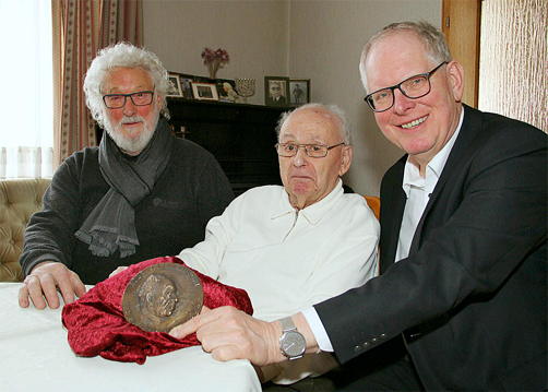 Bild: Künstler Heinrich Brockmeier, der Vestische Ehrenbürger Rolf Abrahamsohn und Landrat Cay Süberkrüb (v.l.) mit der Rolf-Abrahamsohn-Medaille.